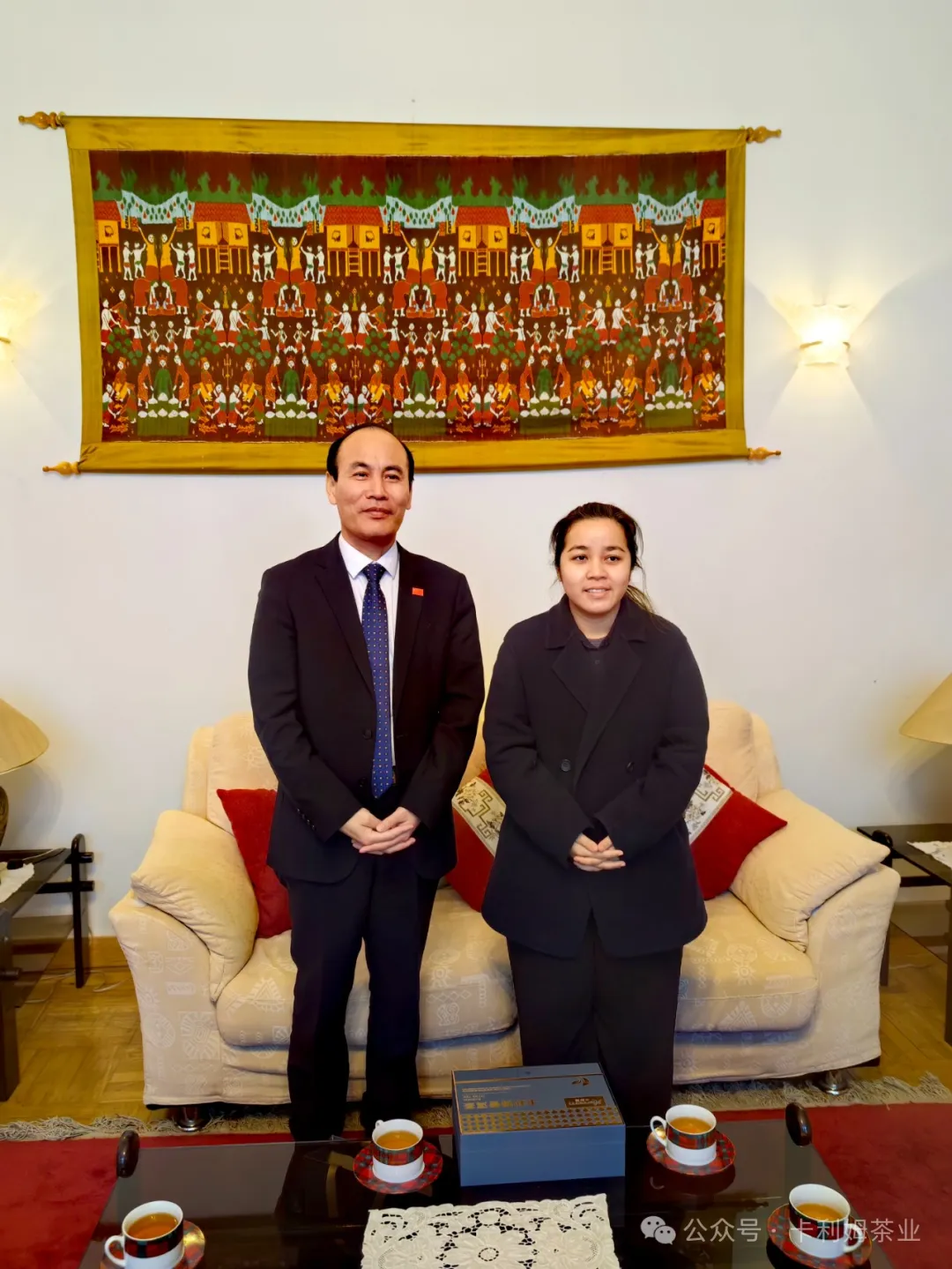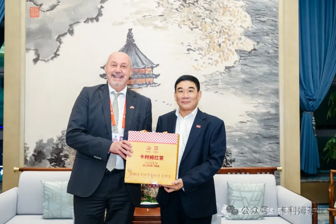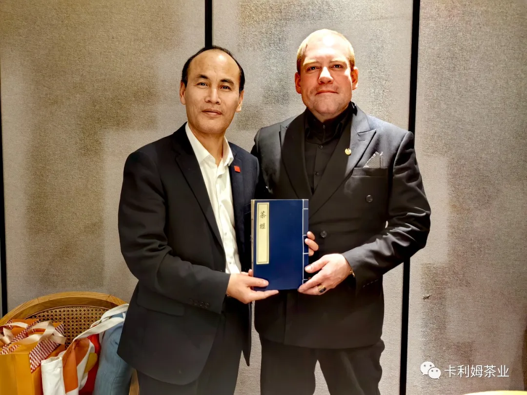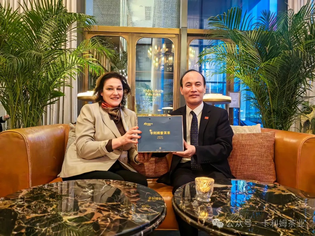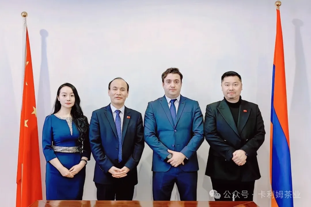 WDEF沃达福副秘书长兼数字汽车产业中心主任冯隆康、WDEF沃达福副秘书长兼对外合作部主任黄天野参加会见。会见后,卡利姆普洱茶作为伴手礼赠送与亚美尼亚驻华大使馆经济参赞卡扎良·科尔伦,表达龙年的新春祝福。