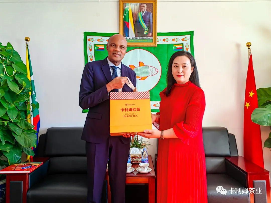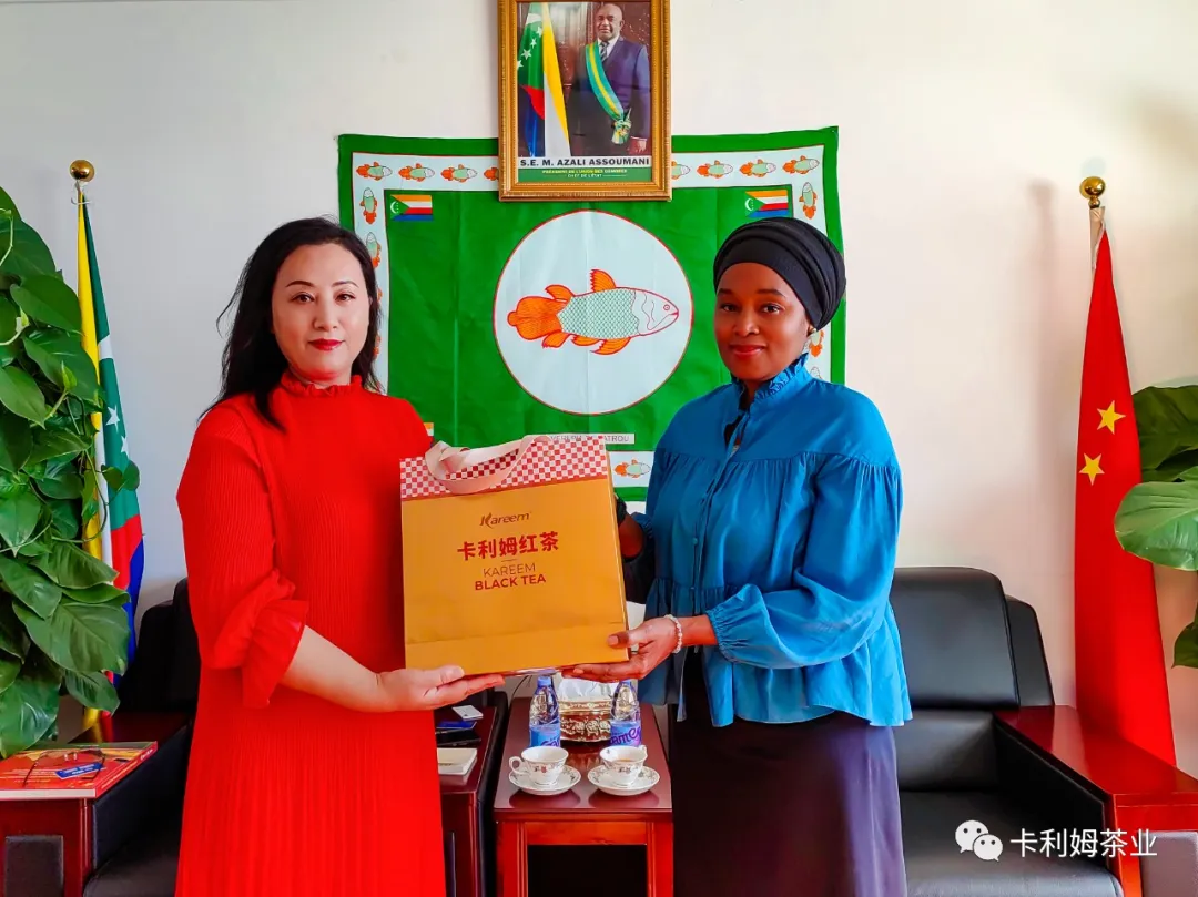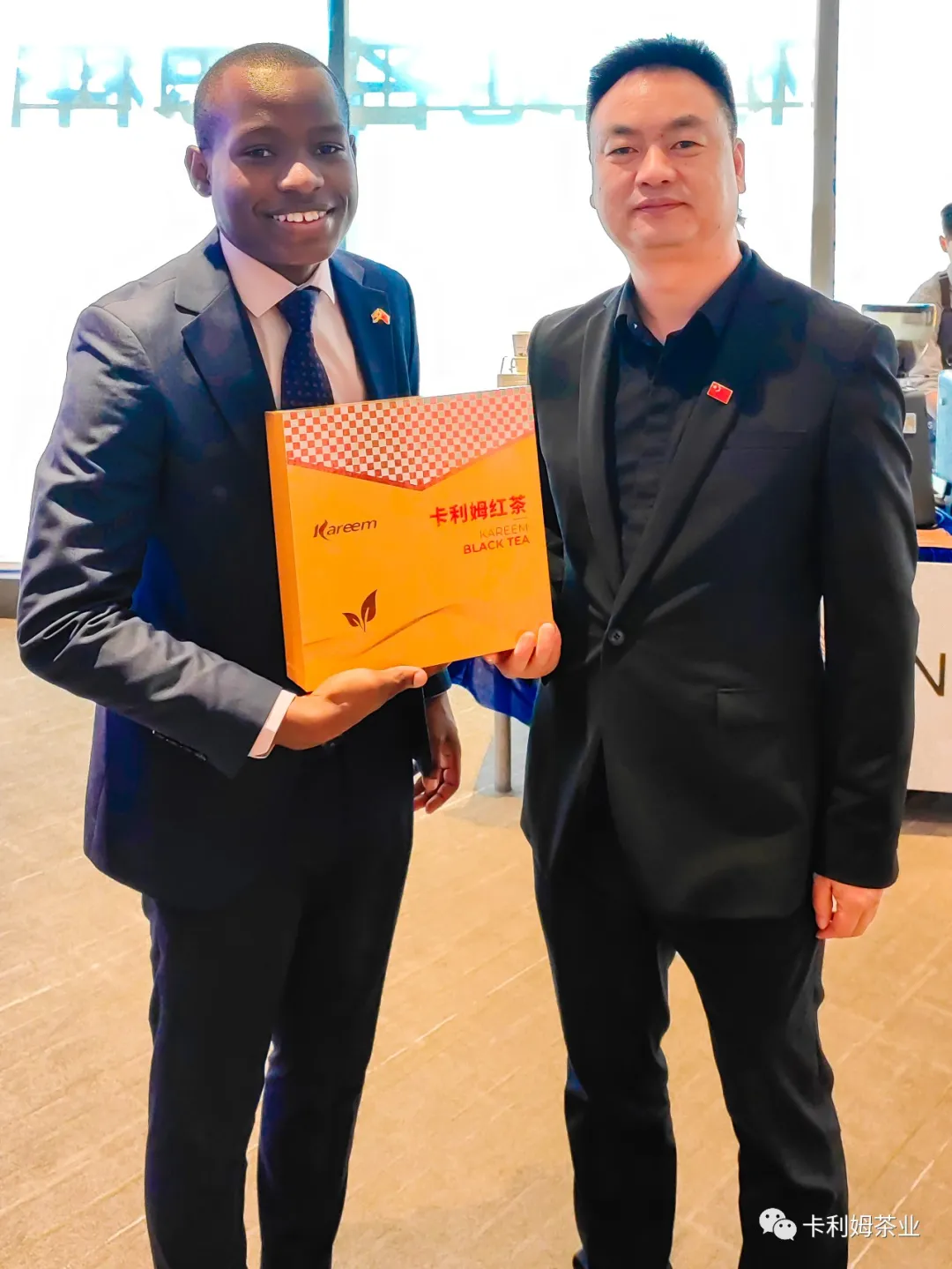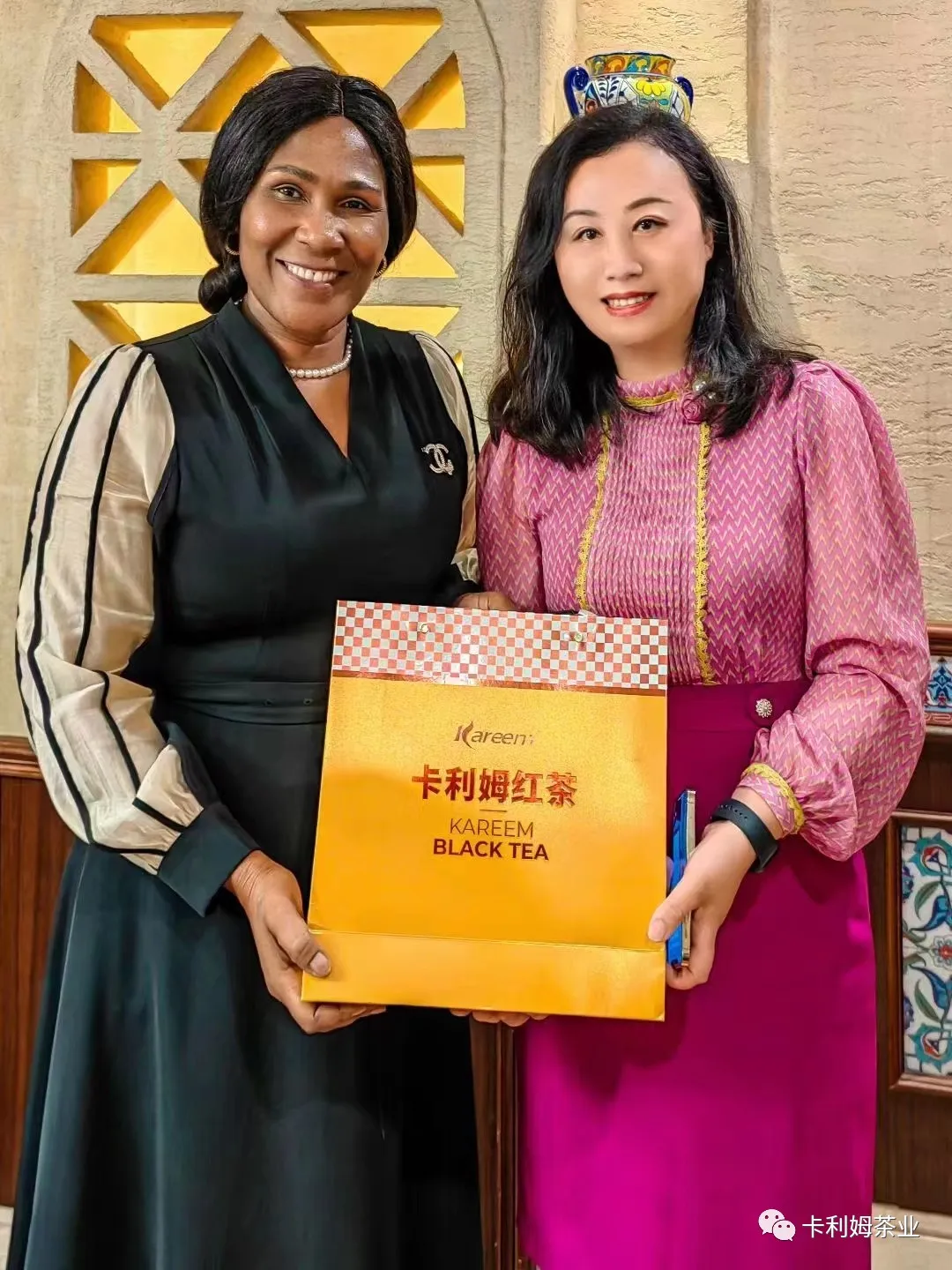 8月8日晚上,卡利姆茶业董事长裴菲在WDEF沃达福数字经济交流晚宴上,8月12日下午在北京齐家园外交公寓,分别将卡利姆红茶作为伴手礼赠送与加纳共和国驻华大使馆临时代办、副大使娜娜·阿库阿·奥乌苏·阿菲利耶女士。副大使表示,我高度赞赏卡利姆茶业提出的“卡利姆红茶飘香全球公益行”这一活动倡议,将卡利姆红茶送与非洲贫困地区的贫困家庭,将中国人民的友爱和祝福送至非洲人民,这是习近平主席倡导的构建人类命运共同体的一项有益践行举措。阿库阿·奥乌苏·阿菲利耶基金会愿与卡利姆茶业一道,携手共同推进卡利姆红茶飘香全球公益行走进非洲,走进加纳。