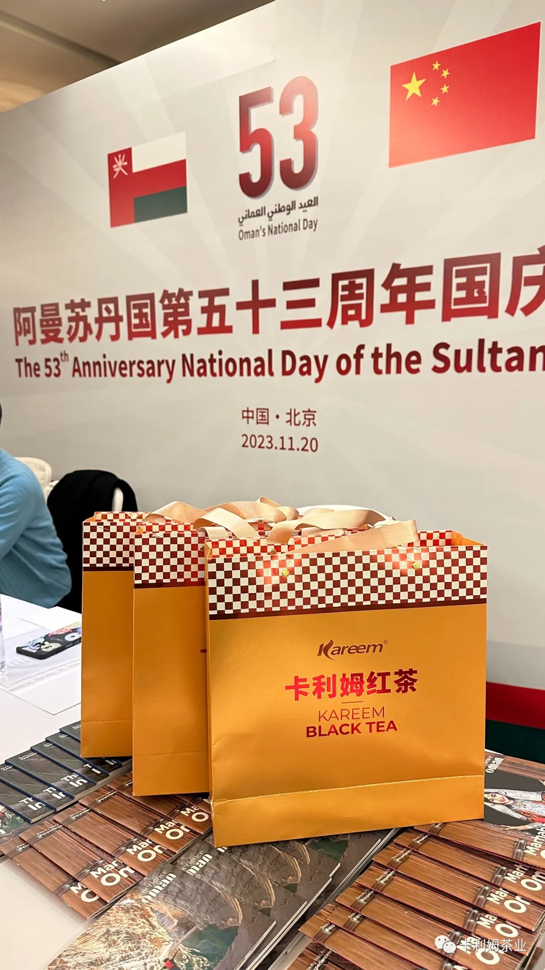 11月2日,阿曼苏丹国驻华大使馆致函北京卡利姆茶业有限公司,诚挚邀请提供卡利姆红茶作为伴手礼赠送与出席阿曼苏丹国53周年招待会的各国外交使节。来函称,阿曼苏丹国国庆53周年即将到来,我使馆将在北京举行盛大招待会。这是阿中关系的一件大事,将进一步推动阿中关系不断深入发展。来函表示,卡利姆品牌积极开展“茶外交”,具有一定国际影响力,推出的高档外事礼茶“卡利姆红茶”赢得了各国的喜爱和欢迎,其包装精致、口感浓厚、所选用的英德红茶金毛毫选自于广东英德英九庄园卡利姆国际友好茶园,多次在国际外交和重大宴会上被列为接待用茶。为了办好此次招待会工作,阿曼苏丹国驻华大使馆诚挚希望贵公司提供“卡利姆红茶”作为伴手礼赠送与各国外交使节。来函表示,中国与阿曼虽远隔山海,但两国人民之间的友好交往跨越千年。阿曼苏丹国驻华大使馆愿与贵公司建立紧密合作,协助卡利姆红茶进入阿曼和阿拉伯国家市场。