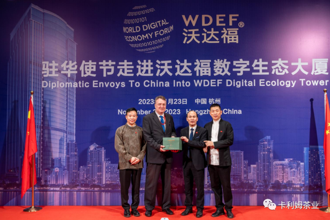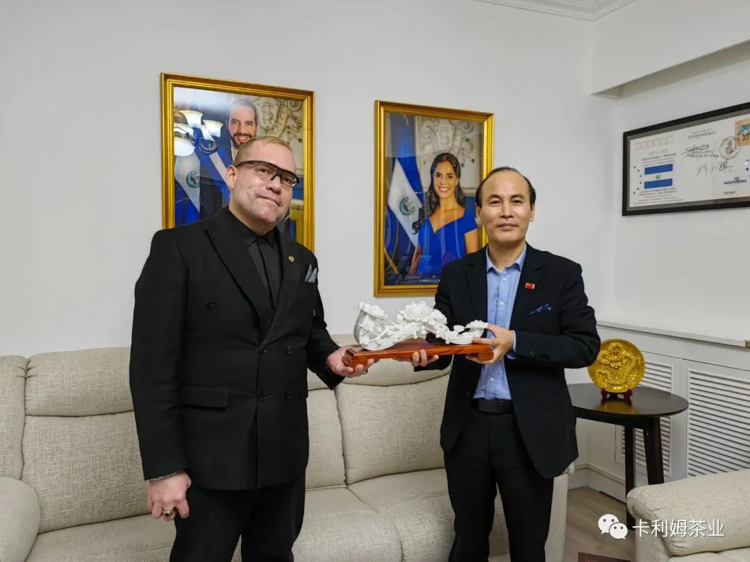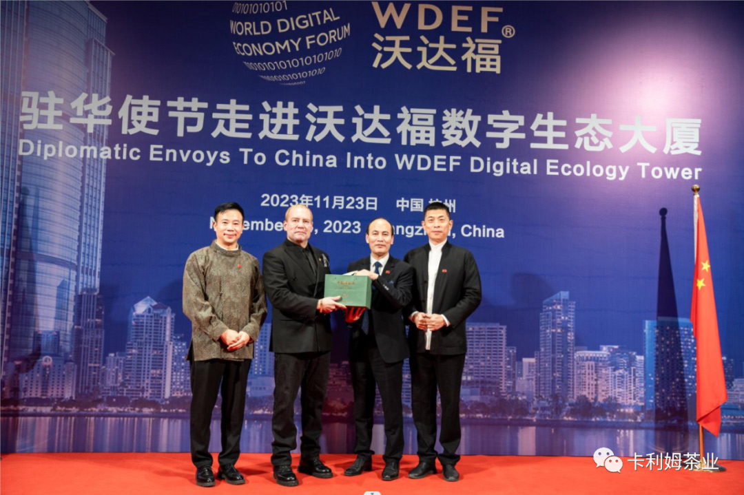 12月15日下午,WDEF沃达福创始人兼执行主席秦勇拜会萨尔瓦多驻华大使阿尔多·阿尔瓦雷斯,送上如意玉雕,祝贺使馆乔迁新址。此外,秦勇还同阿尔多·阿尔瓦雷斯大使深入讨论了萨尔瓦多(杭州)商务中心落地工作细节。这是萨尔瓦多驻华大使馆在北京之外设立的第一个商务中心。此前11月23日下午,WDEF沃达福创始人兼执行主席秦勇(卡利姆)、WDEF沃达福副主席龙宝山、WDEF沃达福数字茶业中心主任银汉晴,以及国家级评茶师、北大国家发展研究院健康茶专家、黄金茶事联合创始人、福建省后井茶业有限公司董事长张忠慧共同将新出品的卡利姆白茶作为伴手礼赠送与萨尔瓦多驻华大使阿尔多·阿尔瓦雷斯。