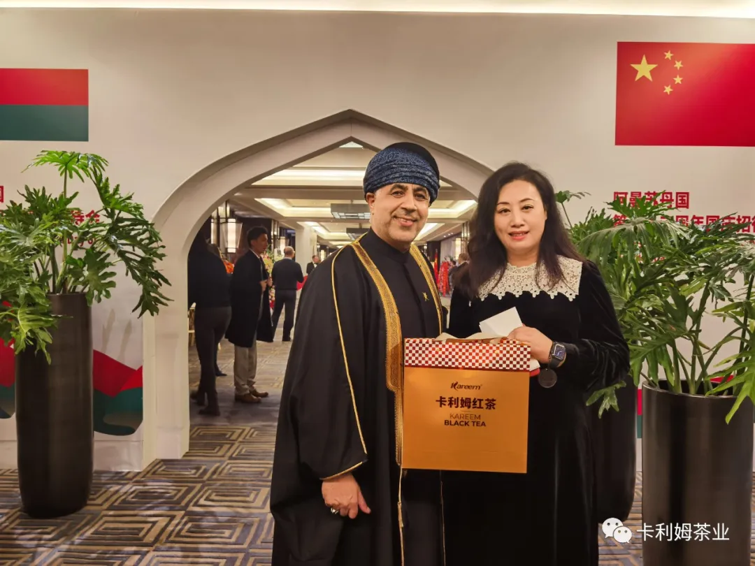 11月20日晚上,阿曼苏丹国驻华大使馆在京举行国庆招待会,庆祝阿曼苏丹国成立53周年。卡利姆茶业董事长裴菲应邀出席,并将卡利姆红茶赠送与阿曼苏丹国驻华大使纳赛尔·布赛义迪。11月2日,阿曼苏丹国驻华大使馆致函卡利姆茶业,诚挚邀请提供卡利姆红茶作为伴手礼赠送与出席阿曼苏丹国53周年招待会的各国外交使节。