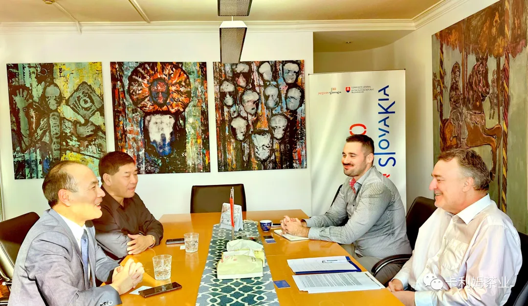 10月30日下午,WDEF沃达福创始人兼执行主席秦勇在上海拜会斯洛伐克驻沪总领事伊戈尔·帕佐拉克,重点推进在杭州举办的第二届全球数字贸易博览会框架下的数字经济国际合作对接会的工作。斯洛伐克驻沪总领事馆商务参赞、副领事弗拉迪米尔·霍多等参加会见。会见后,将卡利姆红茶赠送与伊戈尔·帕佐拉克总领事。