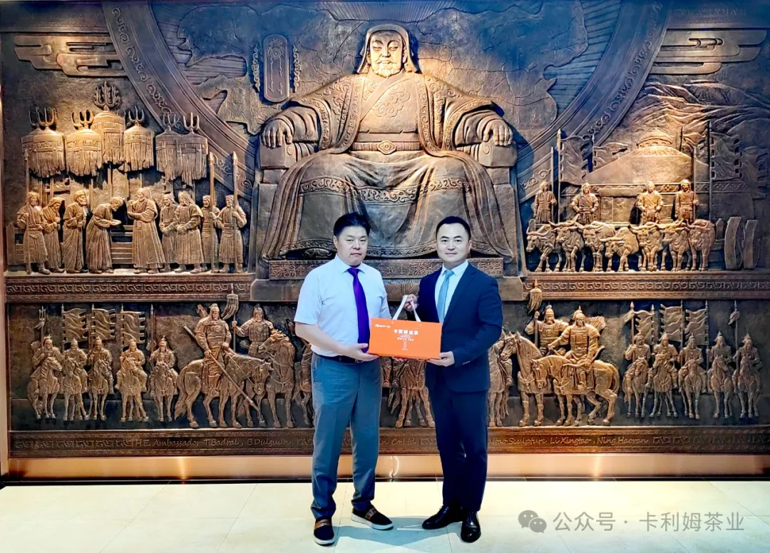 7月11日中午,恩巴洛总统在结束北京访问启程前往上海之际,卡利姆茶业高级副总裁赵国华将卡利姆与大唐贡茶院联名款“卡利姆长兴紫笋茶”、卡利姆与杭州狮龙源联合出品的“卡利姆龙井”赠送与恩巴洛总统,并祝愿恩巴洛总统在华访问成功、旅途平安愉快!