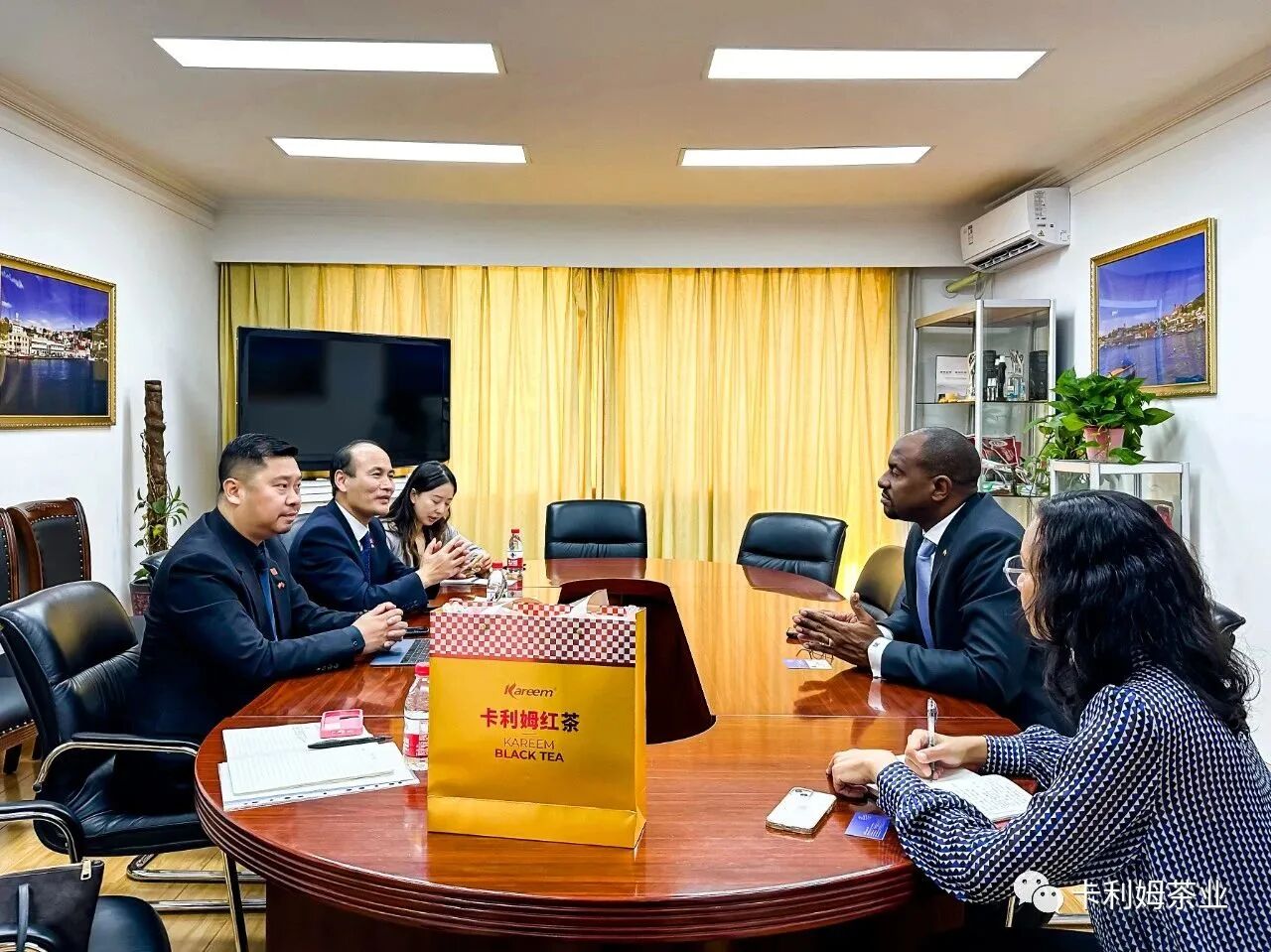 会见后,WDEF沃达福数字茶业产业中心副主任邹文娟将卡利姆红茶作为伴手礼赠送与马岩大使。
