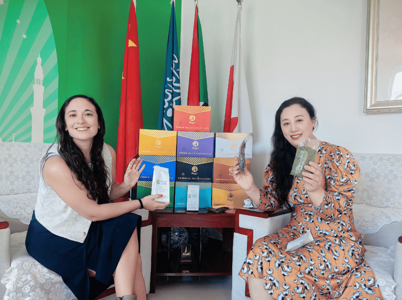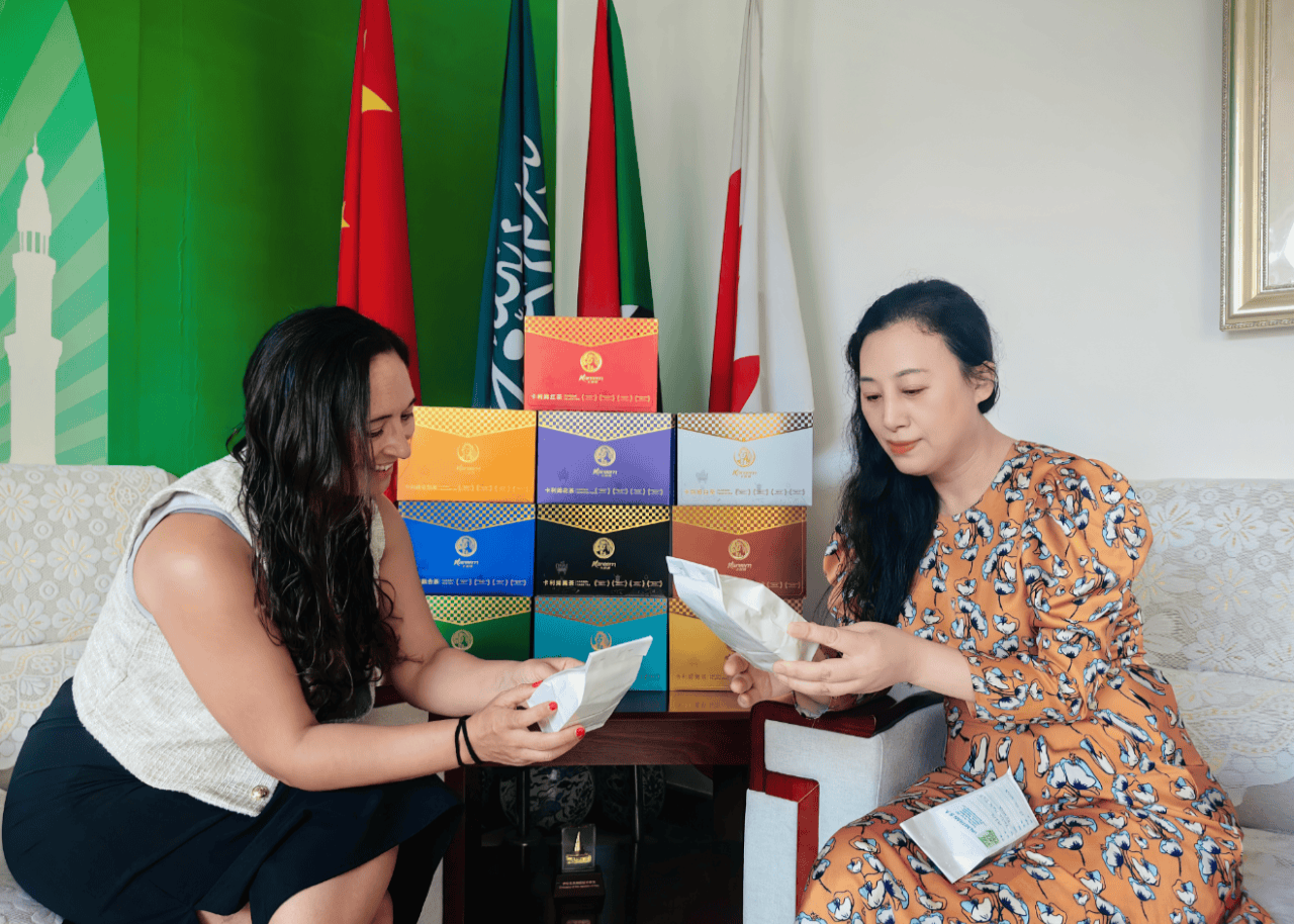裴飛董事长对安吉女士的到来表示热烈的欢迎,并简要介绍了卡利姆茶业的发展历程与品牌理念。她提到,卡利姆茶业自成立以来致力于推动中国茶全球化,同时也重视推动南美茶全球化,积极寻求与国际茶品牌的合作与交流,以期共同推动全球茶文化的繁荣发展。安吉女士则对裴飛董事长的热情接待表示感谢,并分享了阿根廷马黛茶的独特魅力与历史传承。她强调,马黛茶作为阿根廷的国宝级饮品,不仅承载着深厚的文化底蕴,更以其独特的口感与健康功效赢得了全球消费者的喜爱。