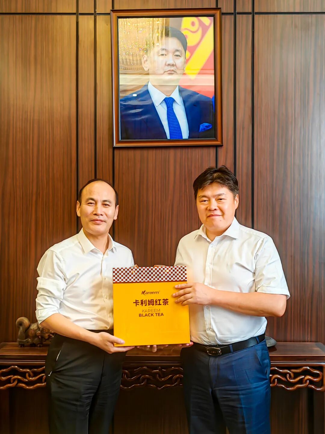 会见后,秦勇将卡利姆红茶作为伴手礼赠送与图门巴亚尔参赞。(完)