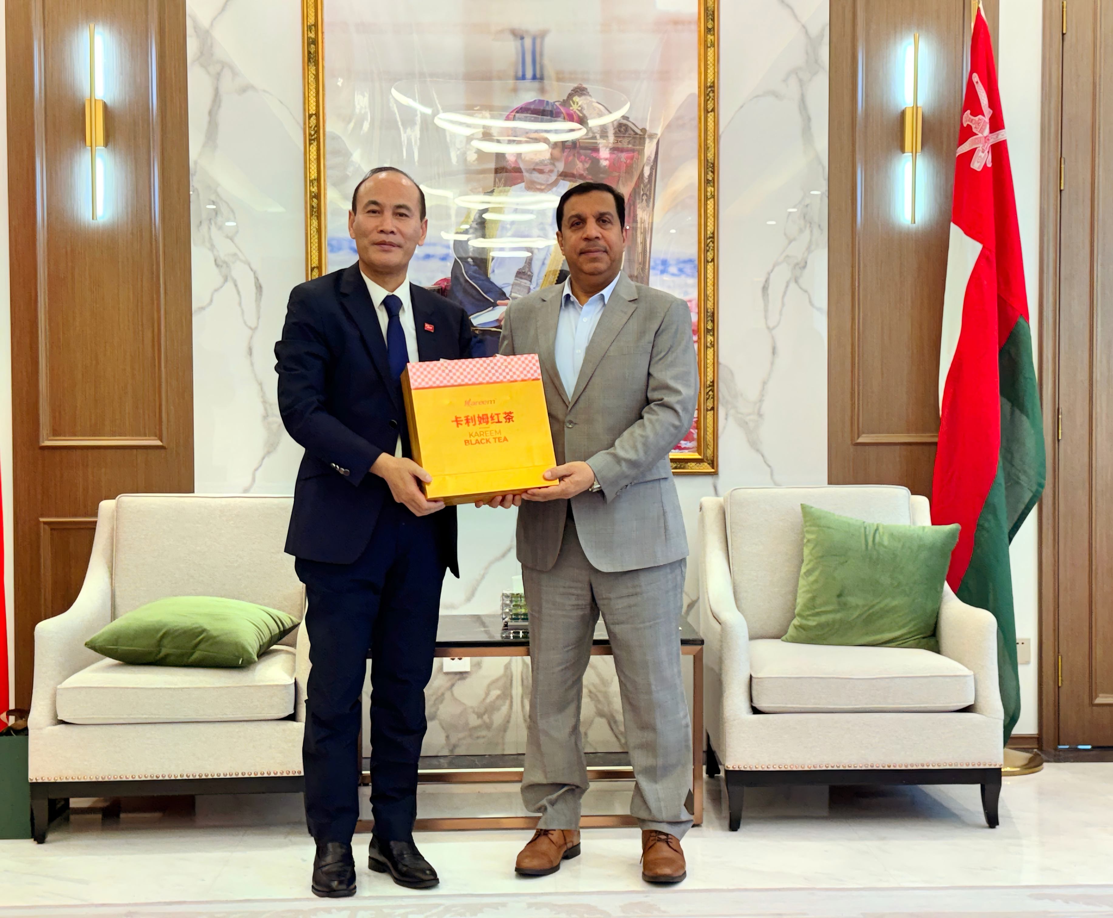 【卡利姆国际动态】2025年11月4日,中阿网创始人、中国阿拉伯交流协会执行会长、卡利姆茶业战略制定者秦勇一行拜会阿曼苏丹国驻华使馆代办、公使阿里·哈桑尼,双方就深化中阿经贸合作、促进文化交流等议题进行深入交流。中阿网总编辑徐学良、总裁杨志军等参加。会谈中,阿里·哈桑尼邀请卡利姆茶业出席即将举行的阿曼苏丹国第55周年国庆招待会,并指定卡利姆茶成为招待会官方伴手礼,赠予各国驻华使节及中方重要领导嘉宾。