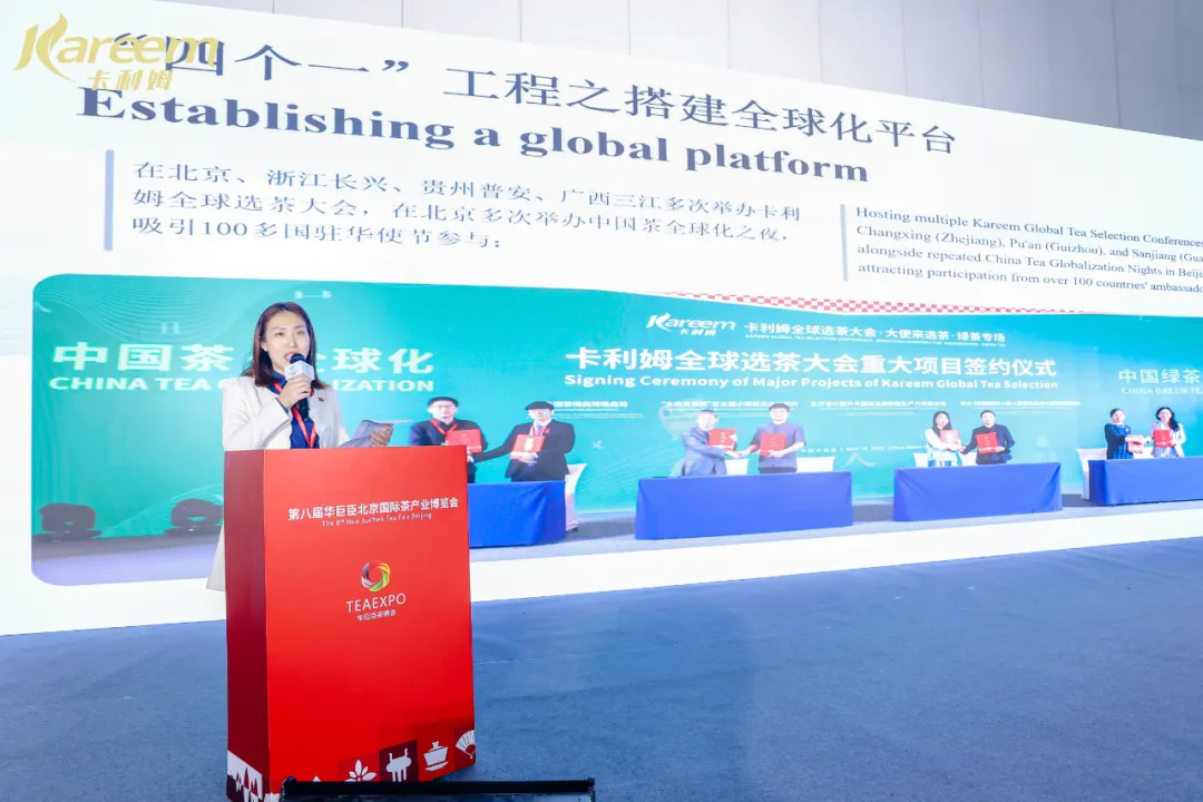 卡利姆茶业高级副总裁、卡利姆全球选茶大会组委会副秘书长魏闪闪介绍,2023年9月,卡利姆茶业正式提出"中国茶全球化"战略,如何让中国茶从"农产品"升级为"文化符号",从"地域特产"转变为"全球品牌",这是卡利姆茶业一直研究而且是必须破解的时代课题。今天卡利姆茶业在北京国家会议中心启动"中国茶全球行"行动计划,重点推进"十百千万"工程:在中东、欧洲、非洲、东盟等国家和地区建立十个卡利姆全球选茶中心;组织百家中国茶企走进中东、非洲、东盟、欧洲等国际市场;培养千名卡利姆国际茶文化推广大使;打造万家卡利姆国际茶文化体验中心。