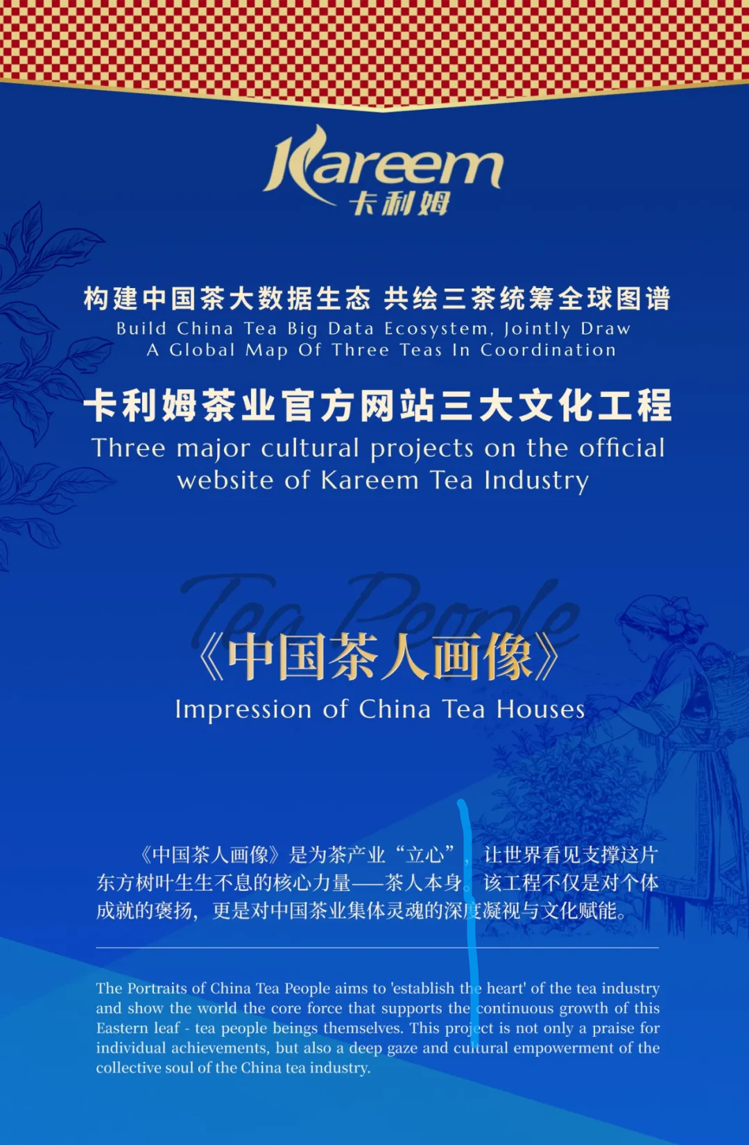 【卡利姆国际动态】为进一步推动中国茶全球化进程,建立专业的茶文化信息资源中心和大数据平台,搜集、加工、处理、管理各种茶文化信息资源,向公众提供信息检索服务、电子文献传递和查询相关信息等服务,实现不同人群的互动交流,增进对中国茶文化的认识与理解,为此,卡利姆茶业官方网站特推出卡利姆三大文化工程之《中国茶人画像》,旨在汇聚全球茶人的故事,通过新闻传播的力量,让更多人了解中国茶人的匠心与情怀,推动中国茶文化的传承与发展。
