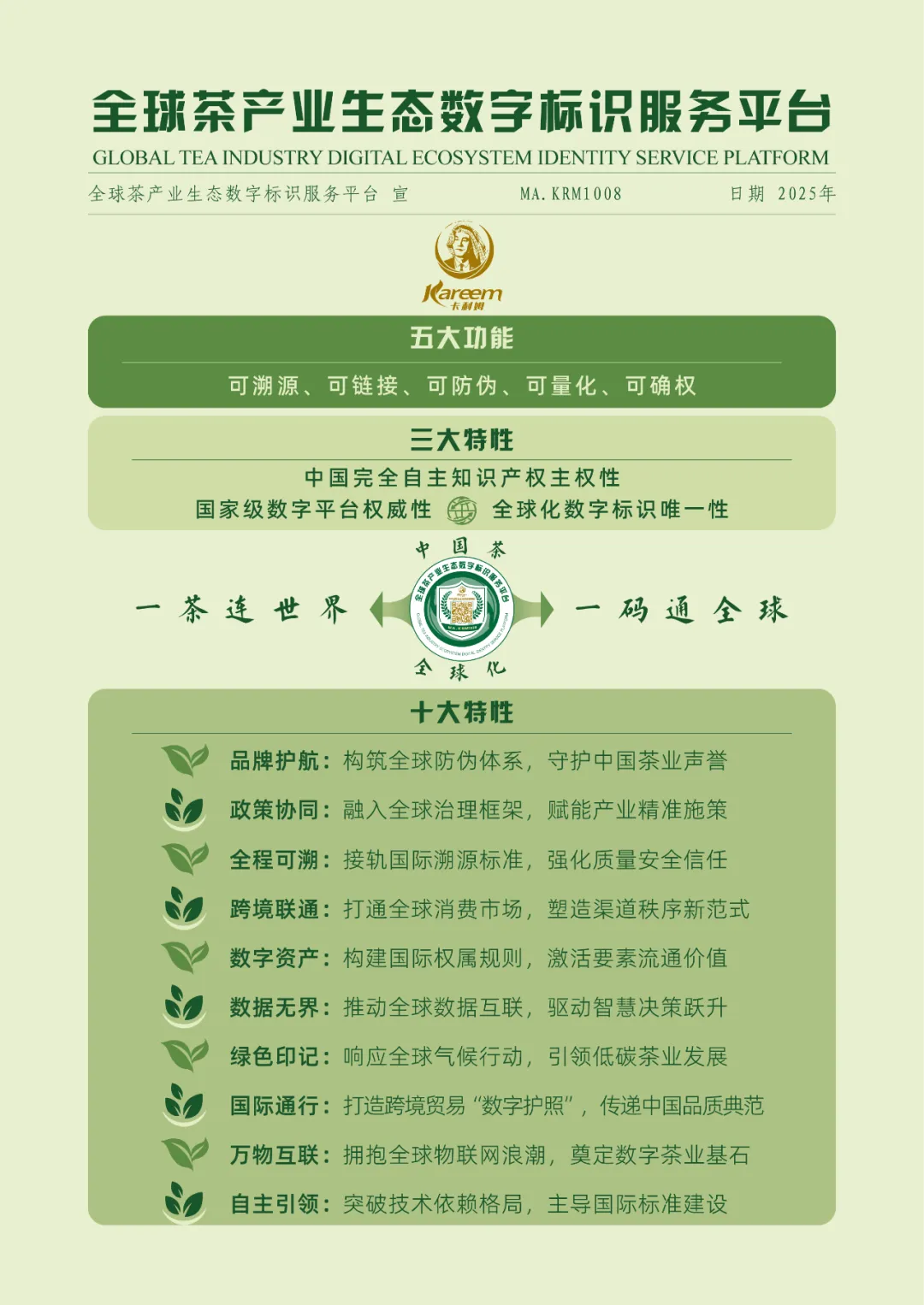 全球茶产业生态数字标识服务平台由中国消费者数字标识服务平台联合北京卡利姆茶业有限公司、卡利姆(杭州)茶科技有限公司共同打造,旨在通过区块链、物联网、大数据等技术,为茶叶生产、加工、流通、消费全链条提供数字化标识服务。